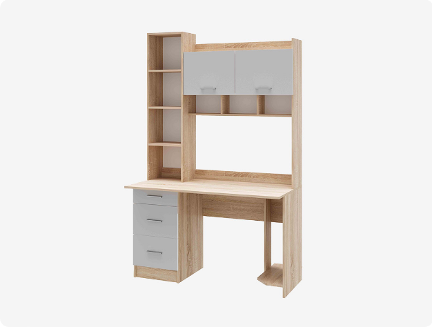 Компьютерный стол ПКС-5 - отличное решение для подростковой комнаты или кабинета. Модель укомплектована ящиками на роликовых направляющих, вместительными шкафчиками с дверками, а также полками.